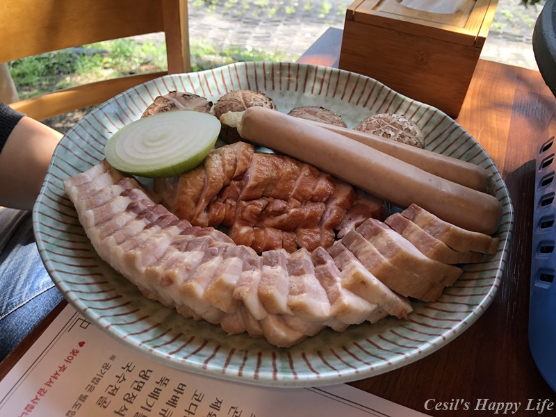 삼겸살과 오리고기와 소세지가 나옵니다.